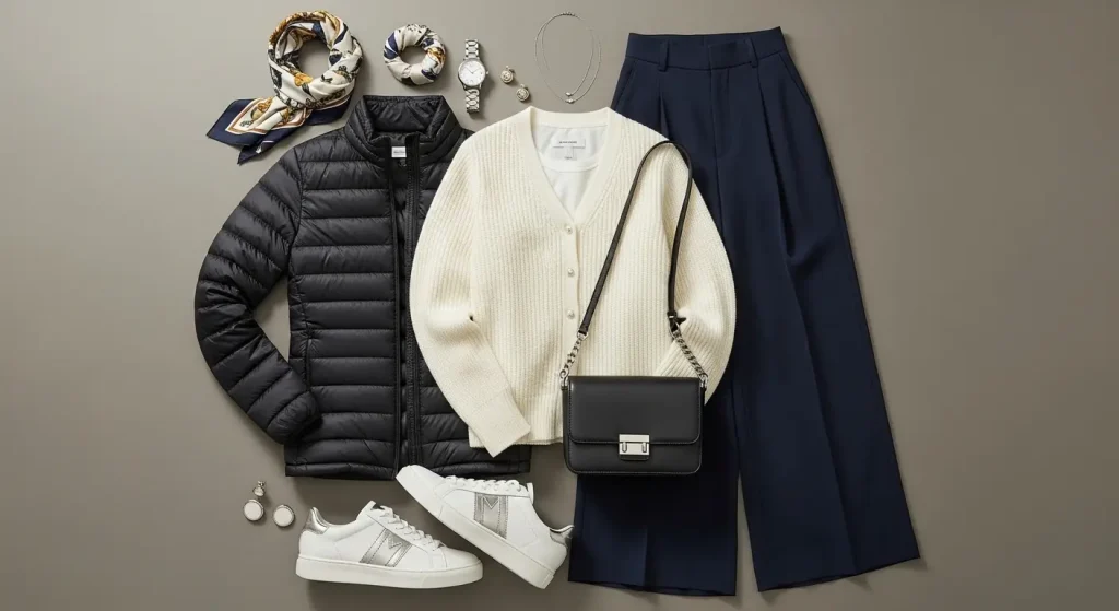 • 屋外(寒い時):軽量ダウンや機能性インナー(ヒートテックなど)で、薄手でもしっかり保温します。カイロや手袋、マフラーといった防寒小物も必須アイテムです。