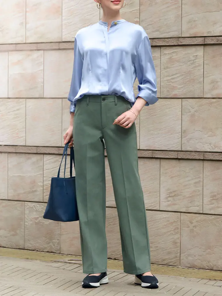 流行に左右されない定番アイテムとして、一本は持っておきたいのがストレートパンツです。腰から裾に向かって真っ直ぐに落ちるシルエットは、脚の肉感や形を拾わずに縦のラインを強調するため、誰が履いても美脚に見える「魔法の法則」が詰まっています。