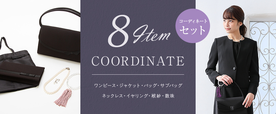 特に便利なのが、必要なものがすべて揃う「オールインワンセット」です。例えば「8点セット」なら、ワンピース、ジャケット、バッグ、サブバッグ、ネックレス、イヤリング、袱紗(ふくさ)、念珠(数珠)まで含まれています。