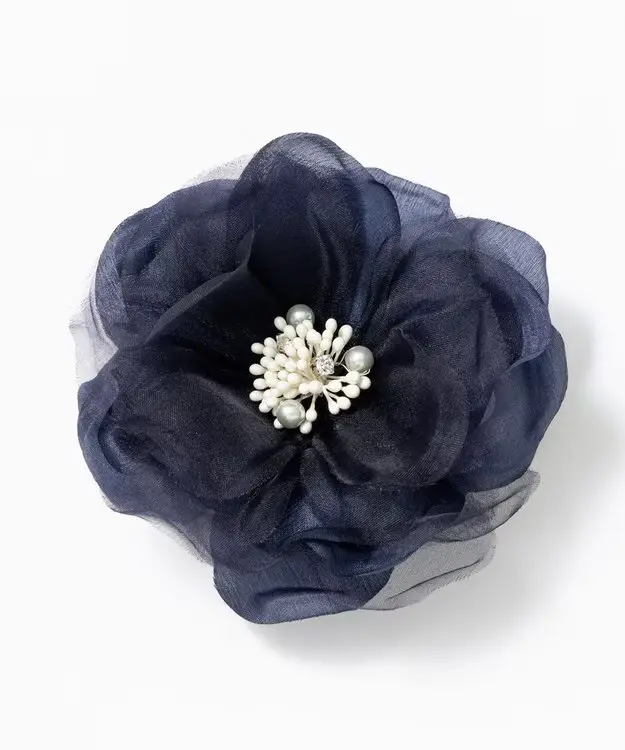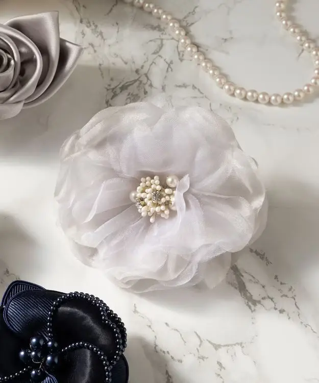 オーガンジーを重ねたボリュームがあるコサージュ。真ん中にはビジューがきらめきラクジュアリーな雰囲気です。