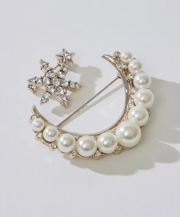 パールの月とビジューの星のブローチセット。単品でつけたり、位置をアレンジしたり色々楽しめます。