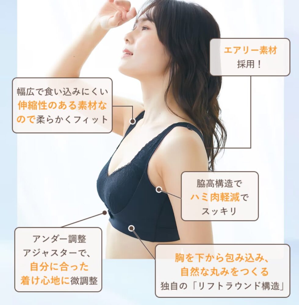 また、一般的な被りタイプのナイトブラとは異なり、肩紐部分に調整可能なアジャスターが付いています。これにより、日中は活動しやすいように少ししっかりめに、夜はリラックスできるように少し緩めにと、シーンや体調に合わせてフィット感を微調整することが可能です。この「24時間使える設計」が、バストの形崩れを防ぎながら快適な着用感を実現しています。