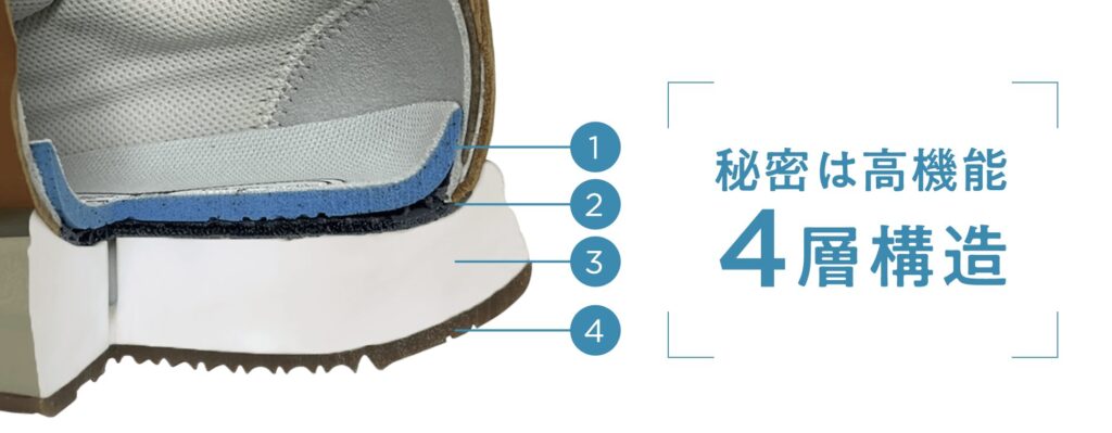 - 膝や腰への衝撃を2から5倍吸収する特許取得の4層構造ソール