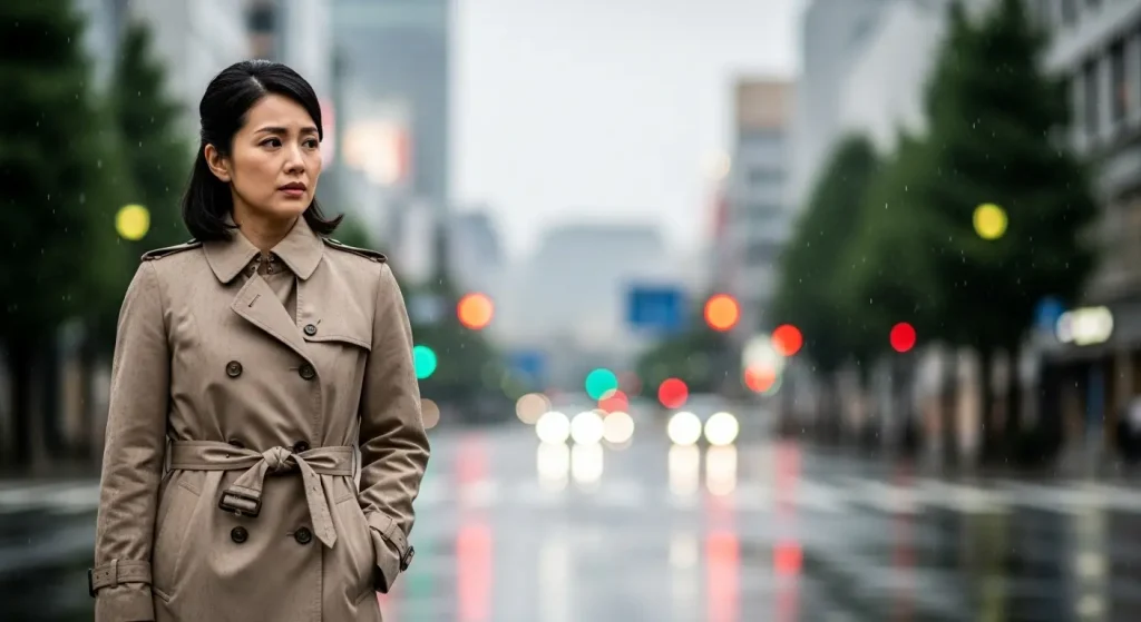 カッチリとした定番のトレンチコート。あの硬い素材感、大きな襟、直線的なシルエットは、まさに骨格ウェーブさんが苦手とする要素の組み合わせなんです。骨格ウェーブさんの持つ柔らかな雰囲気と、トレンチの持つ「マニッシュ(男性的)」な雰囲気が、ちぐはぐに見えてしまうこともあります。