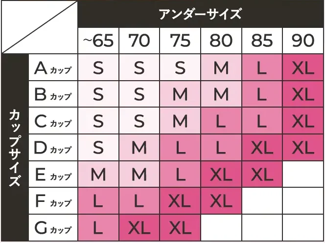 S・M・L・XLの4サイズ展開で、それぞれに対応するカップとアンダーの範囲が細かく設定されているので、自分のバストサイズに合ったサイズを見つけることができます。XLサイズがあることで、大きめのバストの方も安心して選べるようになっているのが嬉しいですよね。