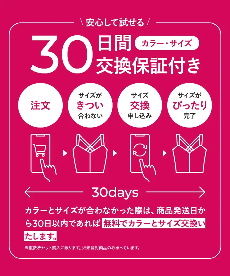 ジャストフィットナイトブラには、30日間のサイズ交換保証が付いています。万が一サイズが合わなかった場合でも、この保証があるので安心して購入できますね。
