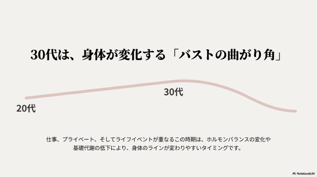 30代を迎え、鏡の前でふと「あれ?なんだか以前よりもバストの位置が下がってきたような気がする」「背中や脇の段差が目立ってきて、タイトな服を着るのが少し怖い」といった変化を感じていませんか?それは決して気のせいではなく、多くの30代女性が直面する「バストの曲がり角」のサインかもしれません。