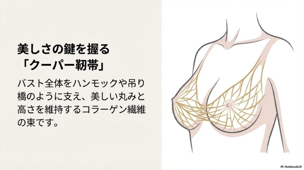 バストのエイジングケアを語る上で避けて通れないのが、「クーパー靭帯」の存在です。これは、大胸筋や皮膚と乳腺組織をつなぎ止めているコラーゲン繊維の束のことで、バスト全体をハンモックや吊り橋のように支え、美しい丸みと高さを維持する重要な役割を果たしています。