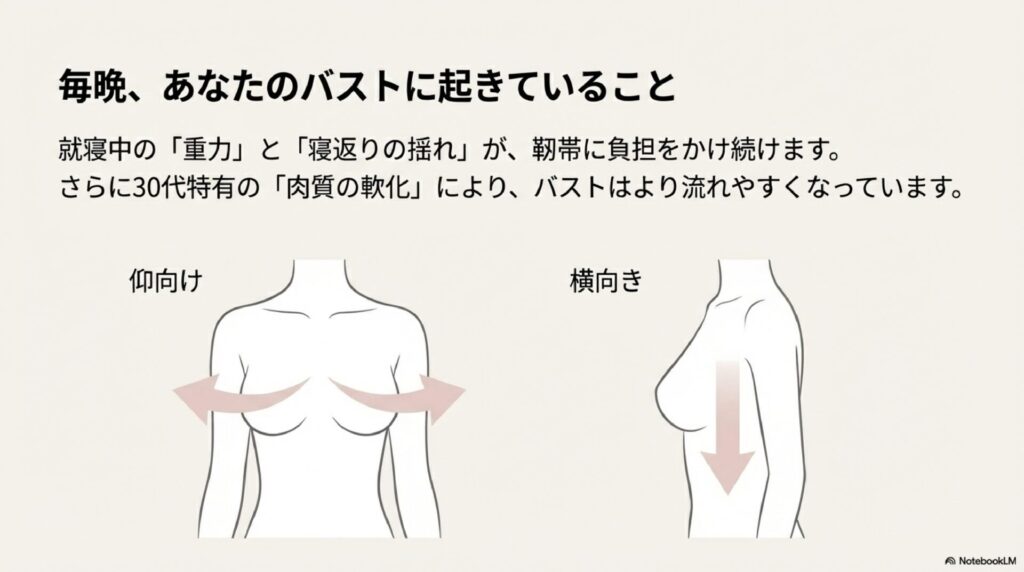 仰向けになれば左右に流れ、寝返りを打つたびに上下左右に大きく揺さぶられます。この毎晩繰り返される「揺れ」と「流れ」による引張負荷が、クーパー靭帯を徐々に、しかし確実に疲弊させ、将来的な「垂れ胸」や「離れ胸」を引き起こす最大の要因となるのです。
