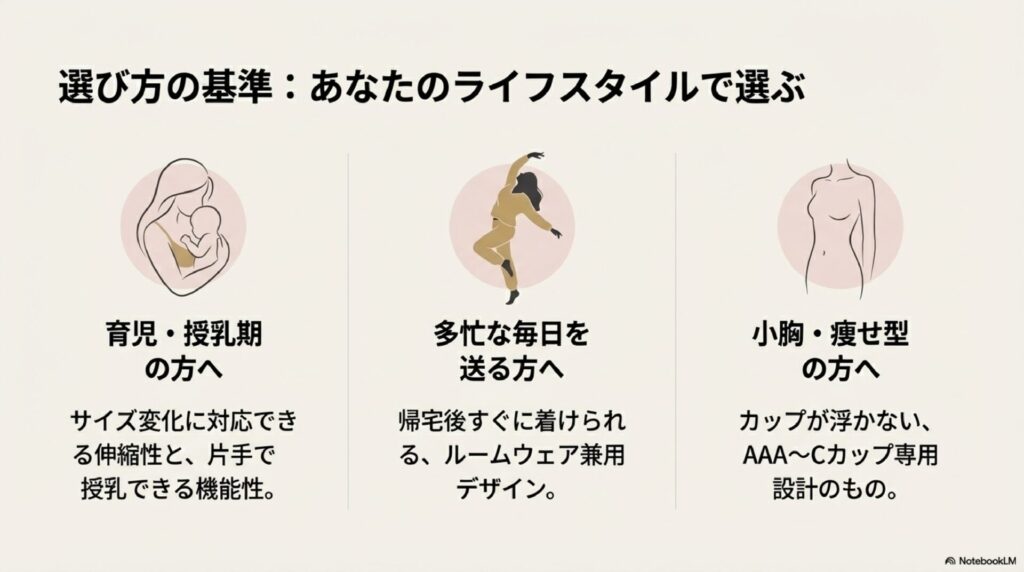 | 育児・授乳中 | 伸縮性が高いノンワイヤー フロントホック式 | 片手で授乳できるか、乳腺を圧迫しない柔らかさがあるか |