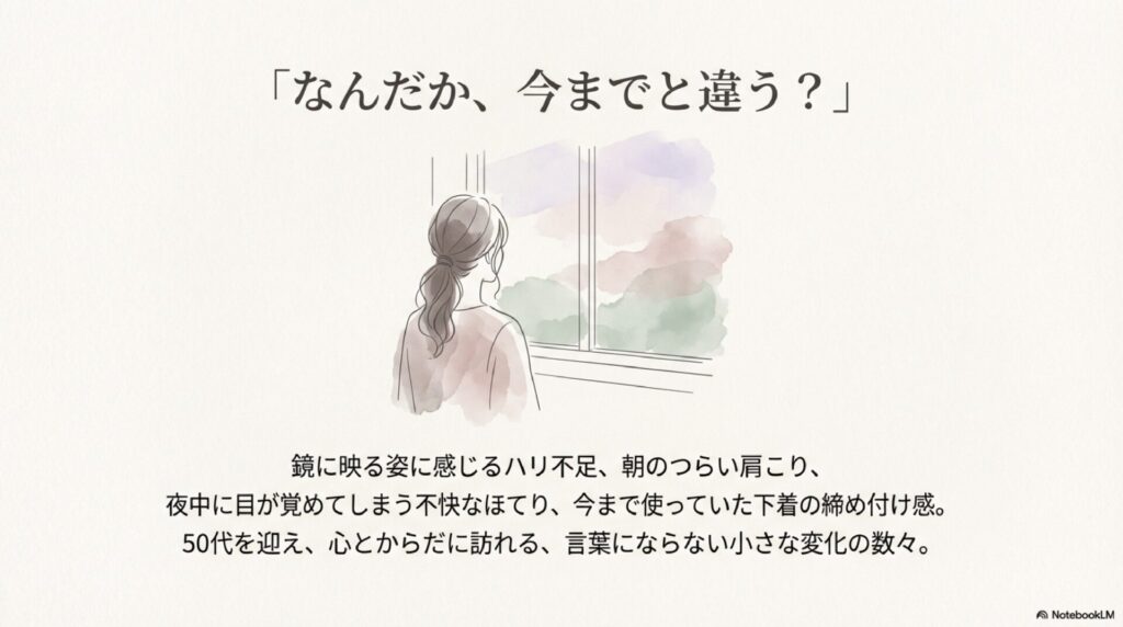 更年期特有のホットフラッシュで夜中に目が覚めてしまったり、今まで使っていた下着が急に窮屈に感じられたりするのも、私たち世代にとって切実な悩みです。本当はもっと自分を労わりたいけれど、何を選べば今の自分に一番優しいのか、迷ってしまうのは当然のこと。