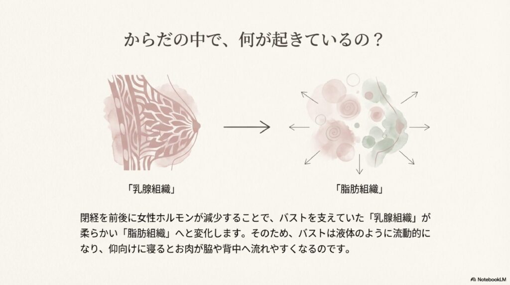 特にバストに関しては、閉経の前後に女性ホルモンであるエストロゲンの分泌が急激に減ることで、身体の内部では大きな変化が起きています。若い頃、バストの形をしっかりと支えてくれていた乳腺組織が少しずつ眠りにつき、代わりにとても柔らかい脂肪組織へと入れ替わっていくのです。