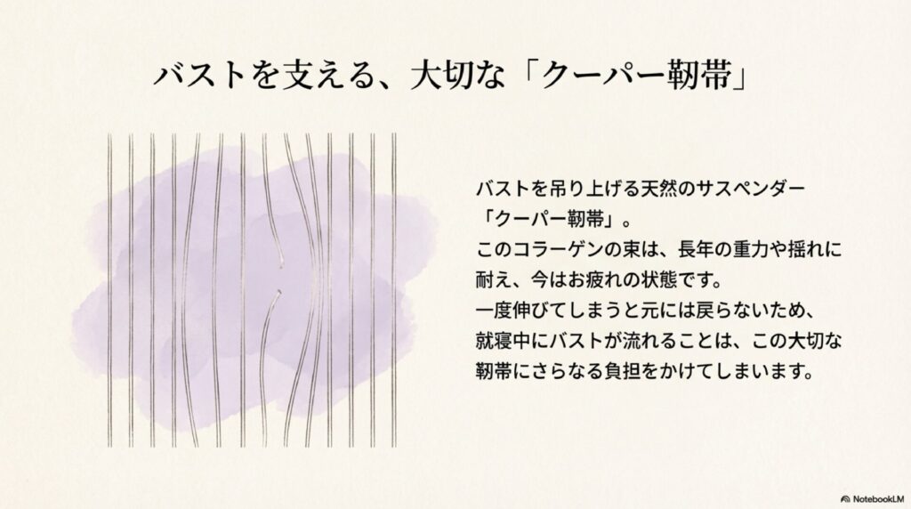 - クーパー靭帯は一度伸びると戻らないため夜の保護が何より大切