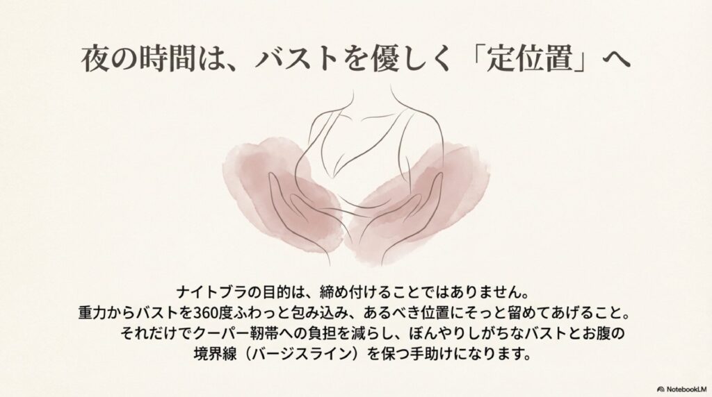 ラインがはっきりしなくなると、どうしても全身が少し疲れた印象に見えてしまうこともあります。でも、ナイトブラで夜の間に「ここはバストの場所ですよ」と優しく教えてあげることで、メリハリのある美しいシルエットを保つお手伝いができます。