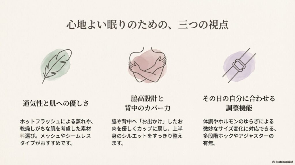 50代の女性が「これにしてよかった!」と心から満足できるナイトブラを選ぶために、プロの視点から3つの大切な基準をお伝えしますね。