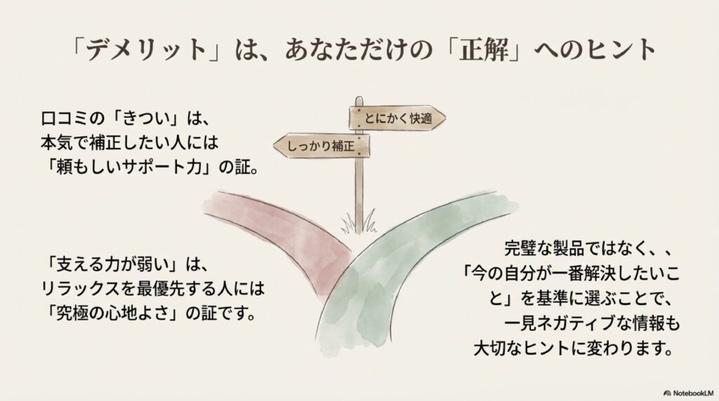 「とにかく肩こりをどうにかしたい」「汗対策を一番に考えたい」「背中の段差を消したい」。そのたった一つの優先順位を決めるだけで、一見ネガティブに見える情報も、自分にとって必要な「正解」を見つけるための大切なヒントに変わります。