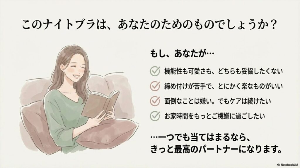 一方で、おすすめする人(=買うべき人)は、「機能性と可愛さのどちらも妥協したくない人」「面倒な洗濯やパッドの着脱が嫌いで、楽にケアを続けたい人」「締め付けが苦手で、優しい着け心地のブラを探している人」「お家時間をお洒落に過ごし、自己肯定感を上げたい人」です。