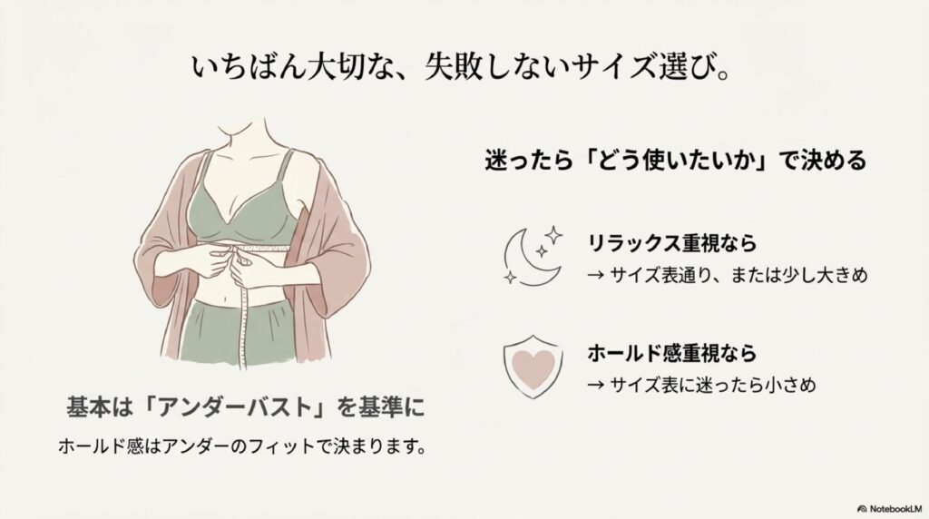 サイズ選びのポイントとして、まずは「アンダーバストを基準にする」ことをおすすめします。ナイトブラのホールド感はアンダーのフィット感で決まるからです。