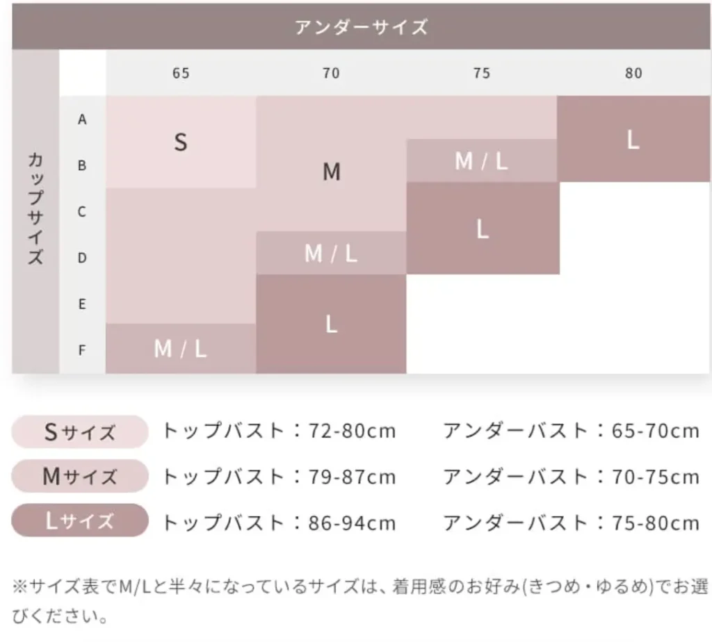 公式サイトのサイズ表を見ると、普段着けているブラジャーのサイズを元に選べるシステムになっています。2つのサイズ間で迷った場合は、着用感の好み(きつめ・ゆるめ)で選ぶことが推奨されているんですよね。