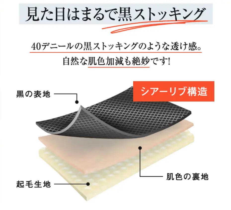 その秘密は、特殊な「フェイクシアー加工」にあります。このタイツは、内側が肌色の生地(裏起毛部分)、外側が薄い黒の生地という二重構造になっています。