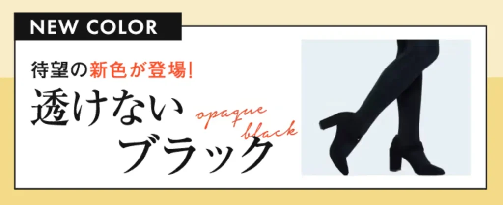 ラインナップには、フェイクシアー(透け感)タイプだけでなく、マットな質感の「透けないブラック」も用意されています。こちらは見た目がシンプルな黒タイツでありながら、1200デニールの裏起毛と強着圧という機能はそのままです。