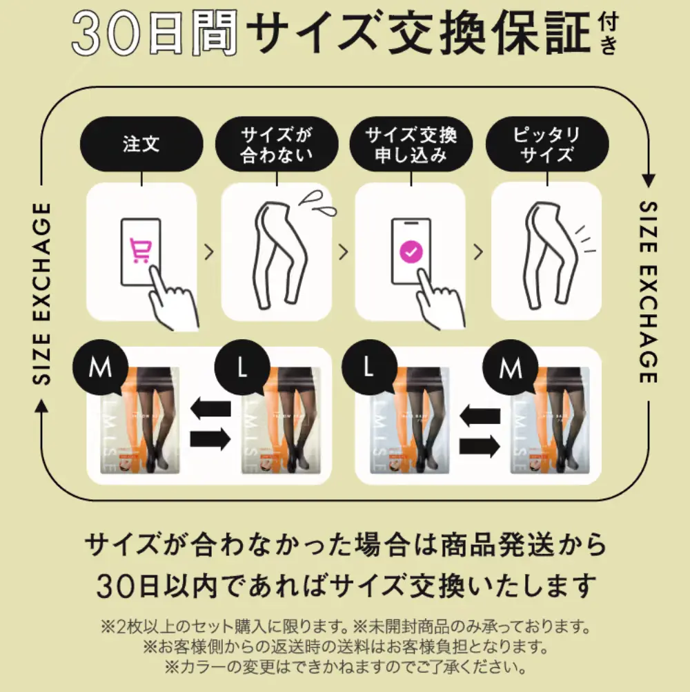 例えば、3枚セットを購入し、まず1枚目を開封して試着したとします。もしサイズが合わないと感じた場合、残りの「未開封の2枚」については、30日以内であればサイズ交換を申請できる、という仕組みです。