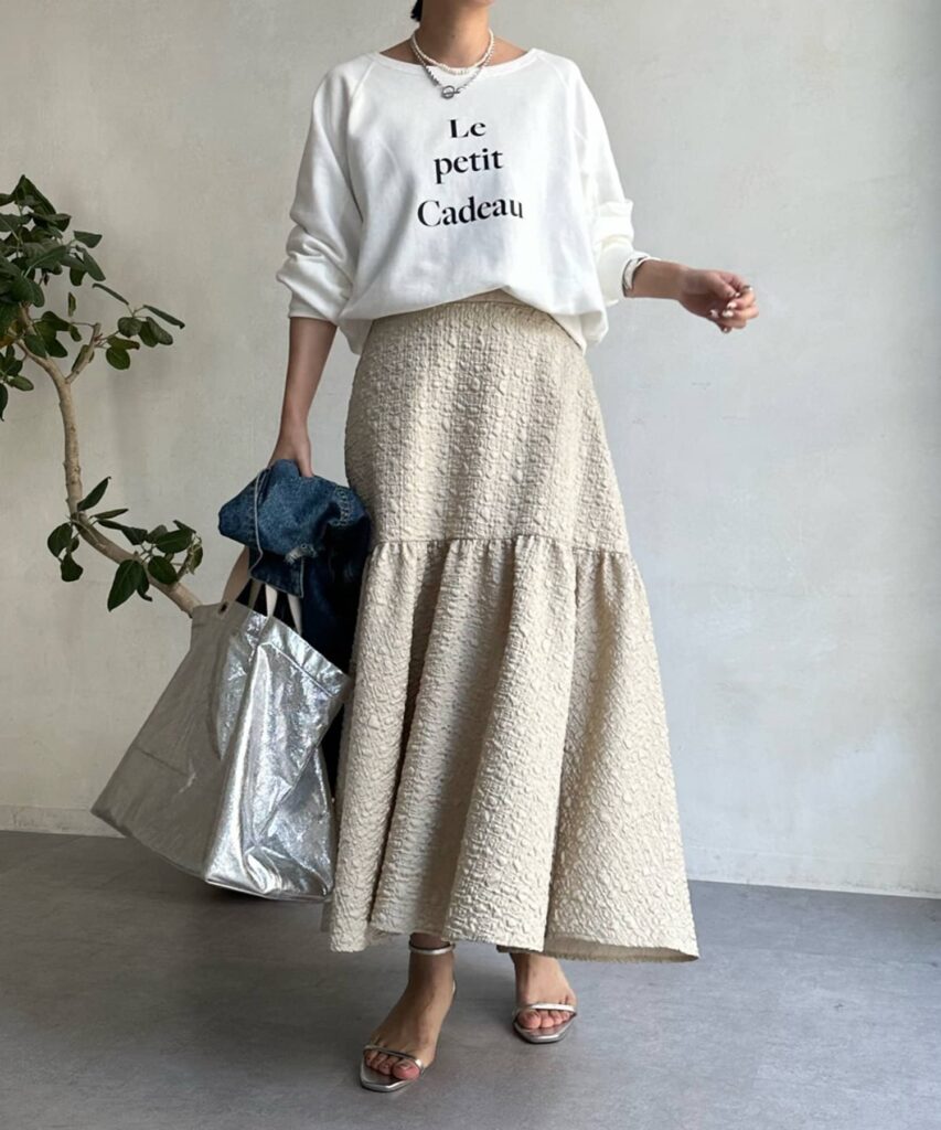 きれいめのロゴスウェットとスカートのコーデ