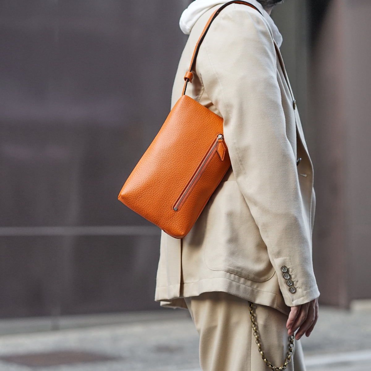 しっとりもっちりとしたシュリンクレザーのサコッシュ。シンプルなデザインがカッコよく、ちょっとそこまで出かけるのにぴったりです。