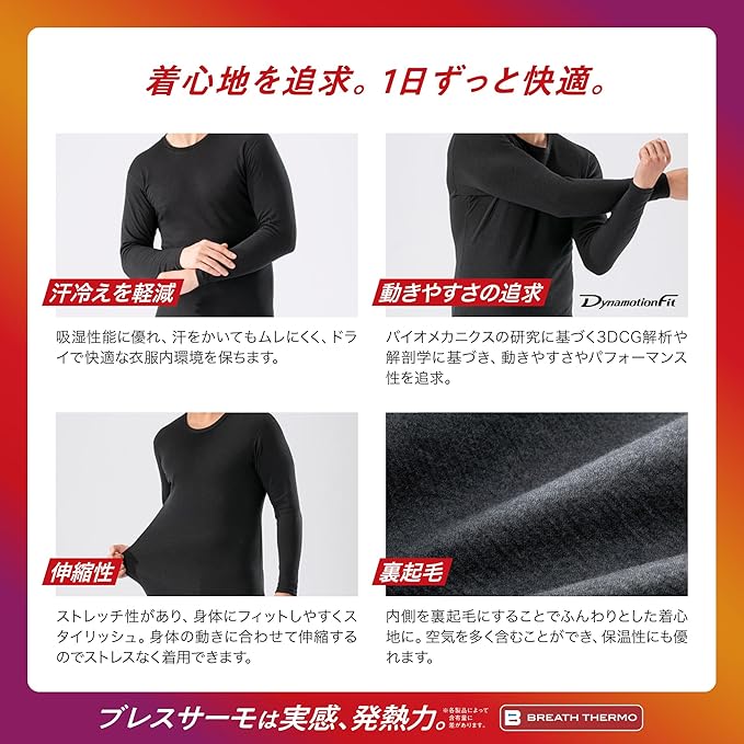 最大の特徴は、独自の吸湿発熱素材「ブレスサーモ」です。これは体から出る水分を吸収して強力に発熱するため、動けば動くほど暖かさを実感できます。