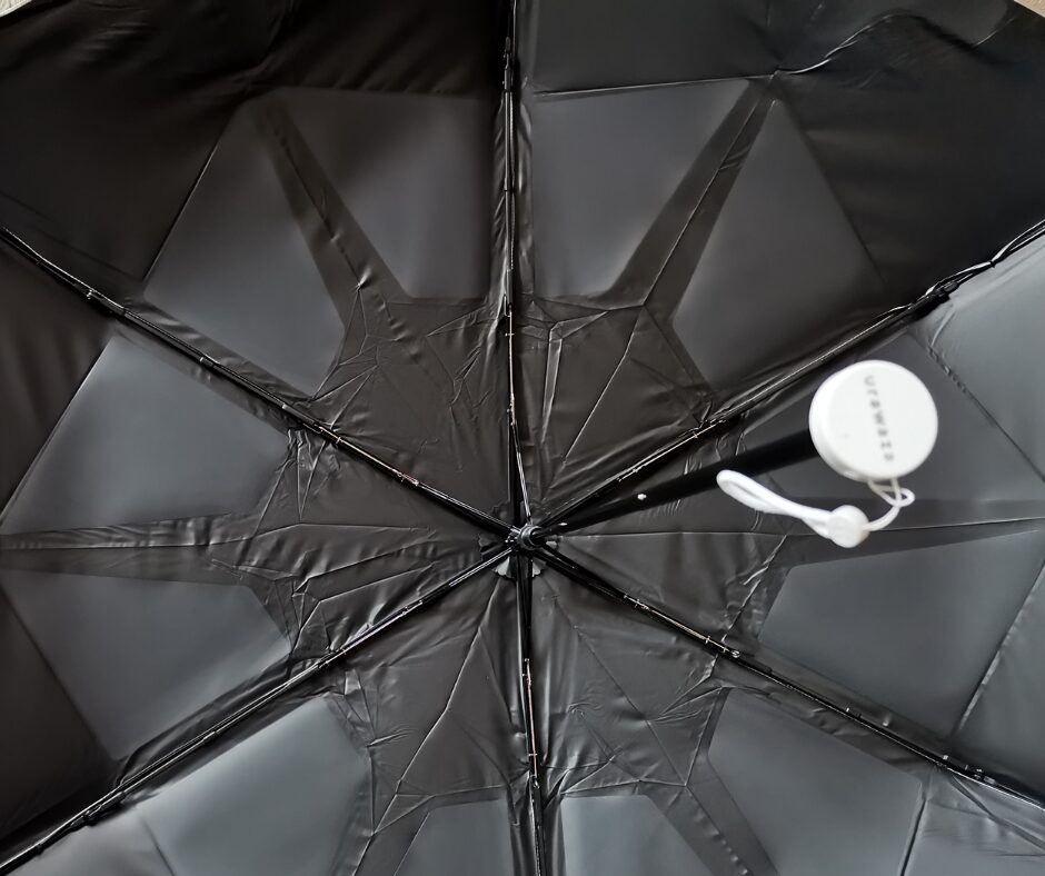 傘を広げて裏側を見てみると、黒いコーティングが均一に広がっています。これが「形状記憶」の正体です。