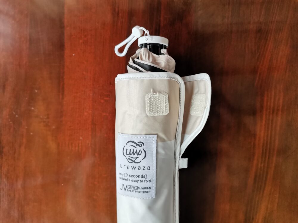 ケースには「only 3 seconds umbrella easy to fold.」「UV UPF50+ SUN&RAIN &HEAT PROTECTION」という表記もあり、UV・雨・熱の3つのプロテクション機能を備えていることがひと目でわかります。また、ケース上部にはストラップが付いていて、バッグの中で迷子になりにくい設計も嬉しいポイントです。