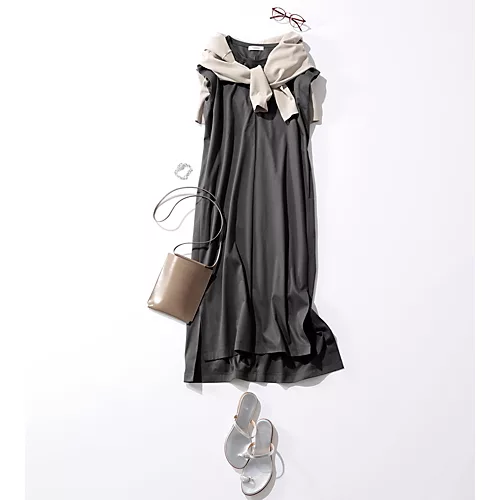 Iラインのワンピースで気になるお腹やお尻をカバーして、ショート丈のカーディガンを羽織ると、上半身がコンパクトに見えて、脚が長くみえます。