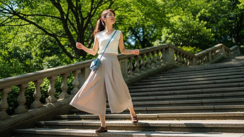かつての「キュロット」をイメージされるかもしれませんが、最新のスカパンはもっと洗練されています。パンツ部分がワイドシルエットのスラックスのようになっており、都会的でエレガントなデザインが主流です。