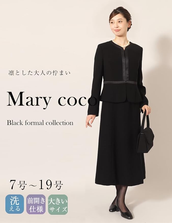 特筆すべきは、ブランドが「上質なブラックフォーマル専用の漆黒カラー素材」の使用を明言している点。色の深みにこだわりたい方には嬉しいポイントです。また、小柄な方向けのAP(プチ)サイズから、ふくよかな方向けのABRサイズまで、極めて広範なサイズ展開も大きな魅力です。