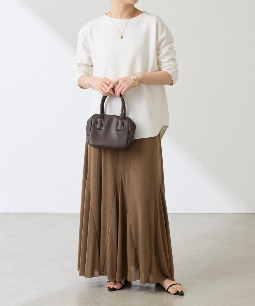 素材の質感の違いがお互いを引き立て合って、おしゃれ上級者のように見せてくれます。また、体に優しくフィットするリブニットをインすれば、上半身がすっきりして、着痩せ効果も期待できます。