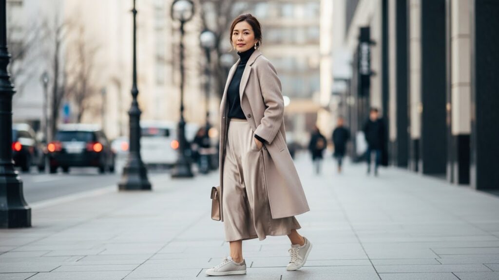 光沢のあるレザーやサテン素材のスニーカーを選び、きれいめなパンツやスカートに合わせる。