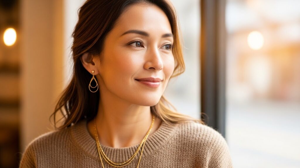 大ぶりのイヤリングやロングネックレスは、視線を顔周りに集めてリフトアップ効果を演出してくれます。また、金属やパールの輝きが光を反射し、肌のくすみを飛ばす「レフ板」のような役割も果たしてくれるのです。