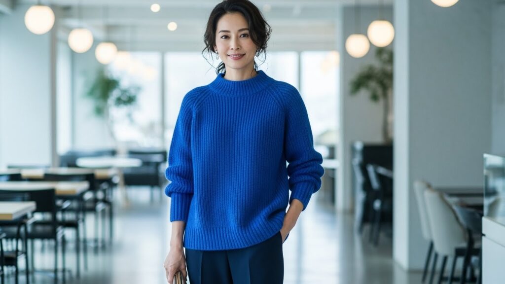 2026年の冬におすすめしたいのは、「ロイヤルブルー」です。この色は知性と品格を象徴するだけでなく、日本人の黄み肌のくすみを払い、透明感を引き出してくれる「救世主カラー」です。