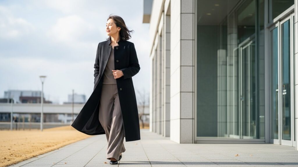 ロングコートやジレの前を開けて羽織り、体の中心に縦の「Iライン」を作りましょう。横幅が分断され、お腹周りが目立ちにくくなります。トップスは前だけ少しインしてドレープを作ると、お腹のラインを曖昧にできます。